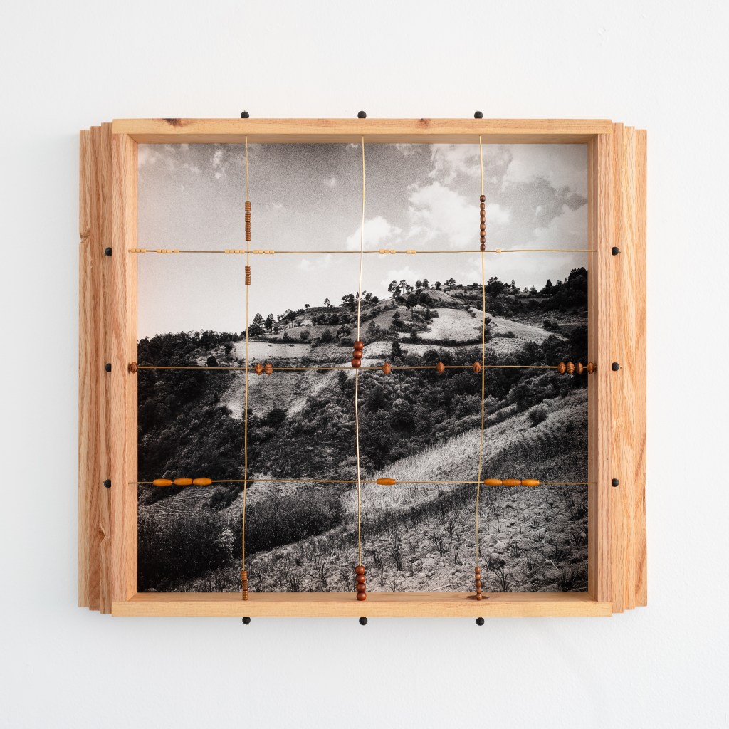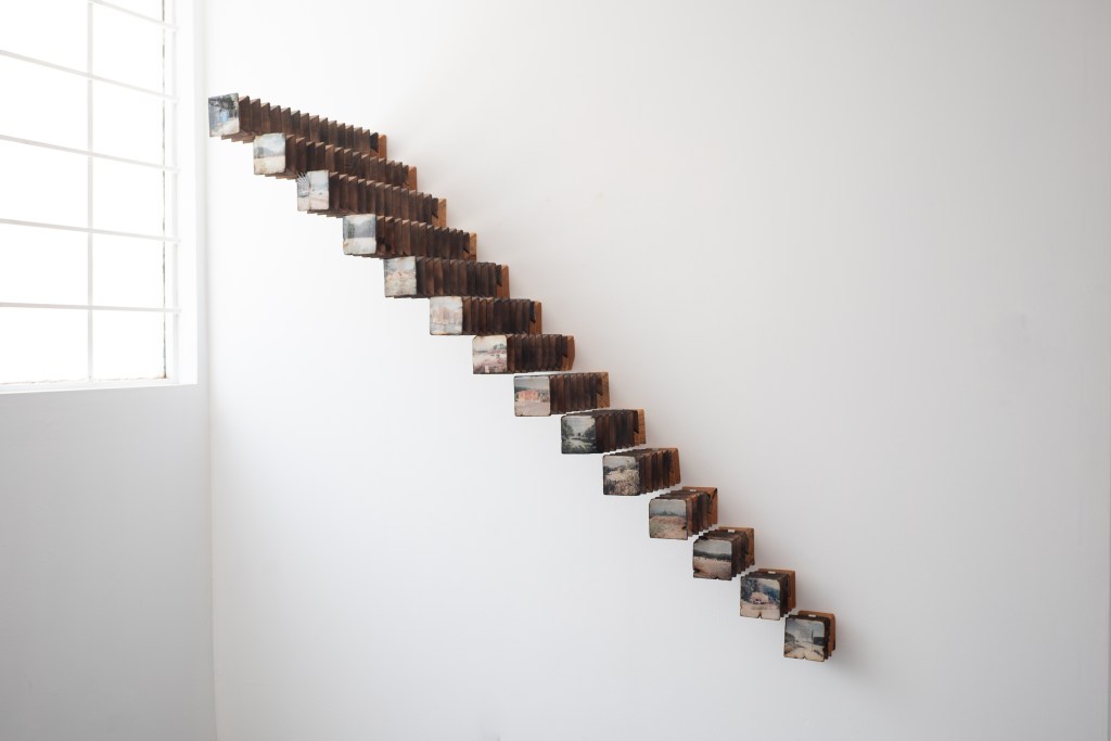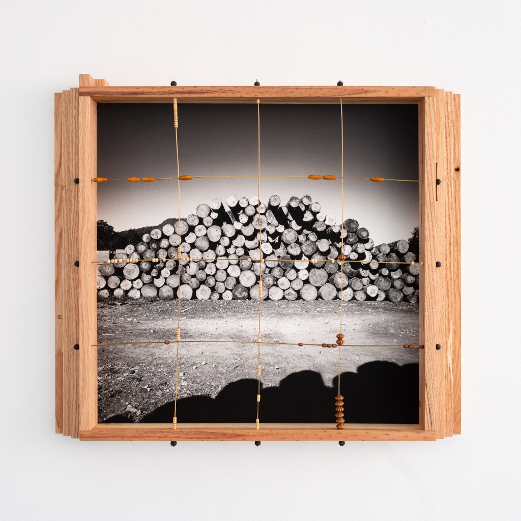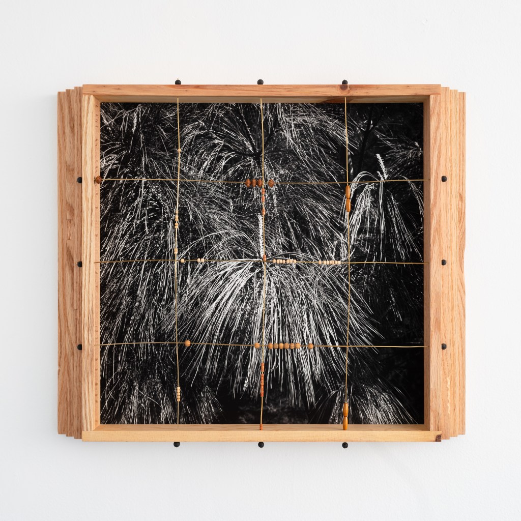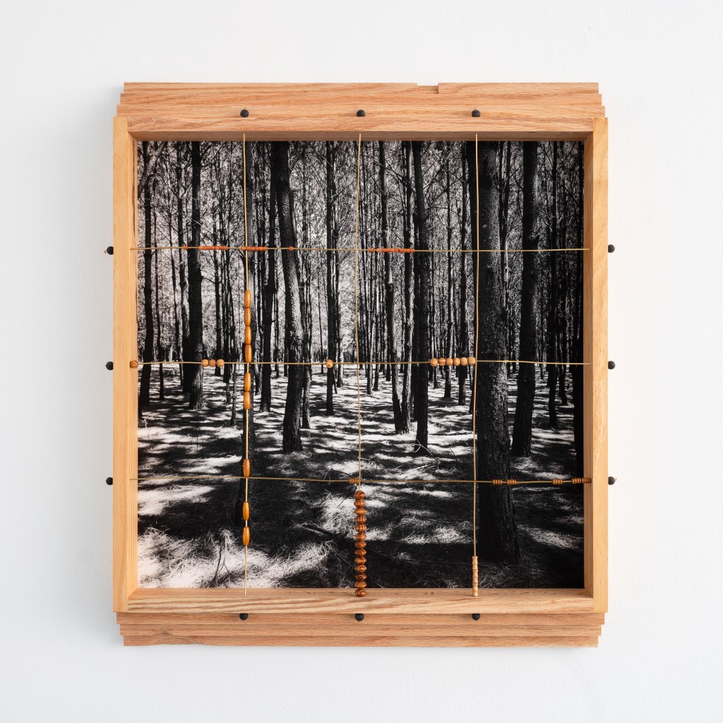 Madera local, ocoxal y latón, vinculados a la historia en los muebles tradicionales y artesanías de la región, se incorporan como extensiones del paisaje. En un juego entre la problematización entre artesanía, arte y la persistencia de las formas, al artista le interesa presentarlos como fragmentos de una red más amplia de transformaciones: extracción, uso, desgaste y recuerdos familiares. En este sentido, cada pieza participa del bosque, en tanto comparte sus ciclos de acumulación y desplazamiento, donde las imágenes nacen de procesos análogos. La diapositiva guarda una latencia contenida en su marco metálico, mientras adquiere peso, espesor, borde. La fotografía se desplaza hacia el espacio, convive con otras materias para recordarnos que sigue siendo bosque aunque materialmente transformado. Cada elemento conserva una memoria táctil, una temperatura, una manera de haber sido parte de aquel mundo, pero también se activan preguntas entre sus materiales y las imágenes que observamos. El artista se acerca a estas materialidades como superficies de reflexión: cómo un tronco deviene tabla, cómo la aguja de pino se vuelve tejido, cómo el metal se incrusta y articula. Cada transformación deja una huella, una manera específica de relación entre cuerpo, herramienta y entorno. A veces miramos hacia arriba, a veces hacia abajo, cada árbol y sus partes, no dejan de ser mundo. Al cruzarse todas las miradas, configuramos un campo donde las imágenes continúan ocurriendo y el bosque sigue siendo.