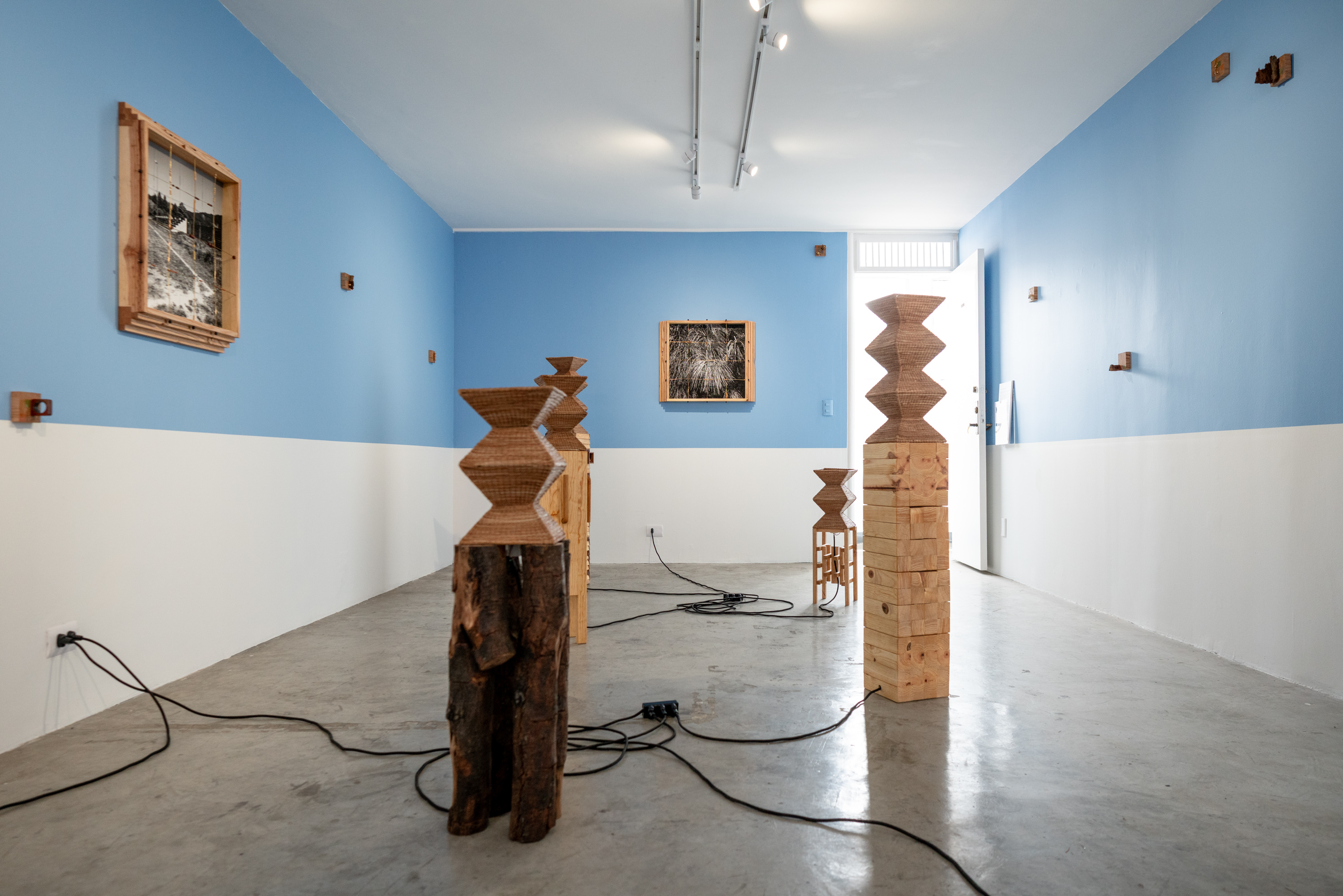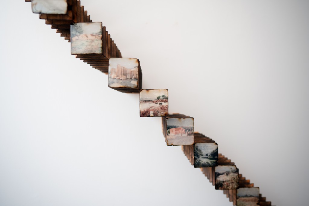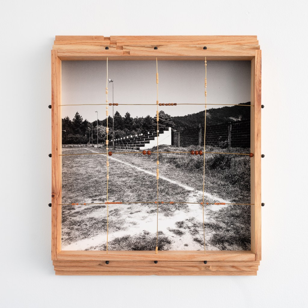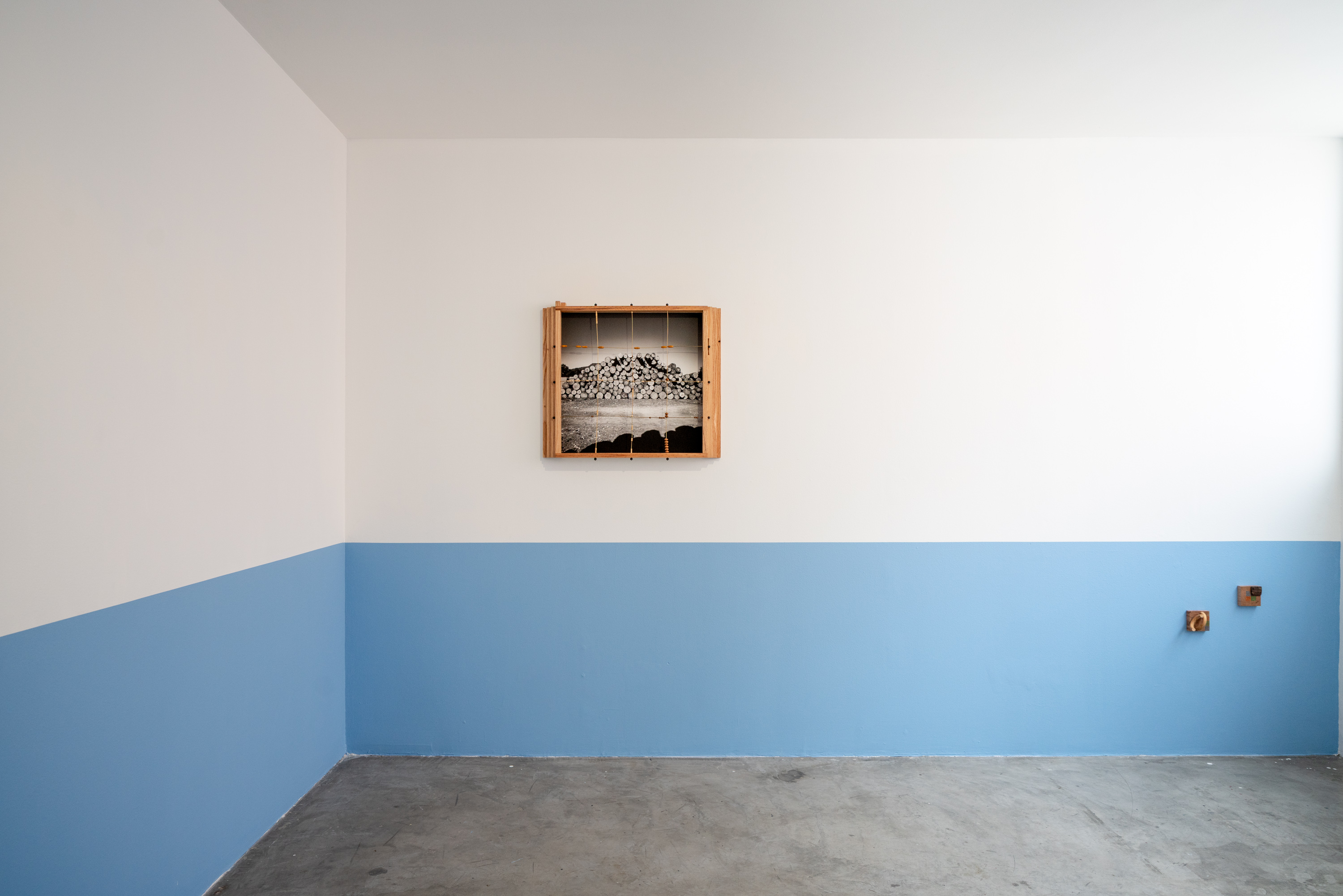 Madera local, ocoxal y latón, vinculados a la historia en los muebles tradicionales y artesanías de la región, se incorporan como extensiones del paisaje. En un juego entre la problematización entre artesanía, arte y la persistencia de las formas, al artista le interesa presentarlos como fragmentos de una red más amplia de transformaciones: extracción, uso, desgaste y recuerdos familiares. En este sentido, cada pieza participa del bosque, en tanto comparte sus ciclos de acumulación y desplazamiento, donde las imágenes nacen de procesos análogos. La diapositiva guarda una latencia contenida en su marco metálico, mientras adquiere peso, espesor, borde. La fotografía se desplaza hacia el espacio, convive con otras materias para recordarnos que sigue siendo bosque aunque materialmente transformado. Cada elemento conserva una memoria táctil, una temperatura, una manera de haber sido parte de aquel mundo, pero también se activan preguntas entre sus materiales y las imágenes que observamos. El artista se acerca a estas materialidades como superficies de reflexión: cómo un tronco deviene tabla, cómo la aguja de pino se vuelve tejido, cómo el metal se incrusta y articula. Cada transformación deja una huella, una manera específica de relación entre cuerpo, herramienta y entorno. A veces miramos hacia arriba, a veces hacia abajo, cada árbol y sus partes, no dejan de ser mundo. Al cruzarse todas las miradas, configuramos un campo donde las imágenes continúan ocurriendo y el bosque sigue siendo.