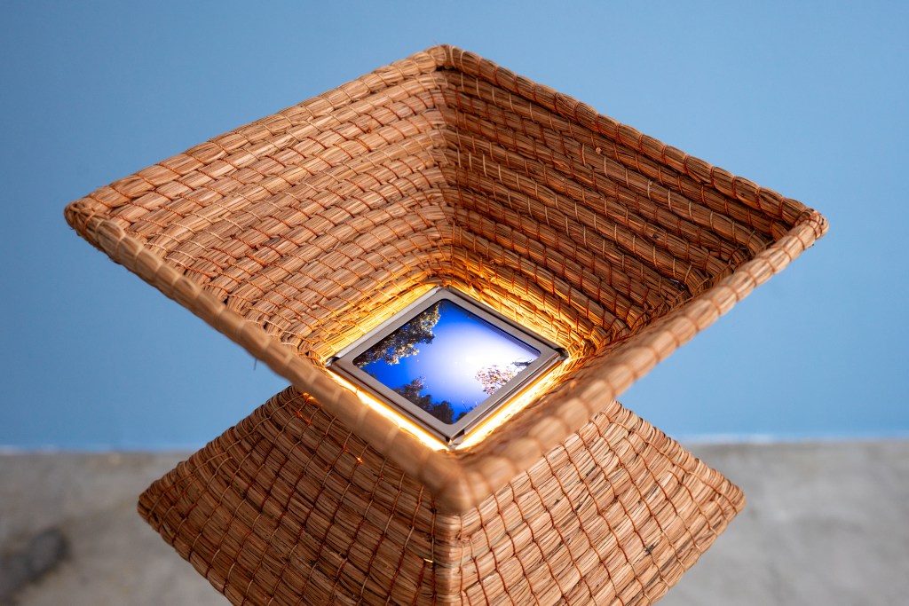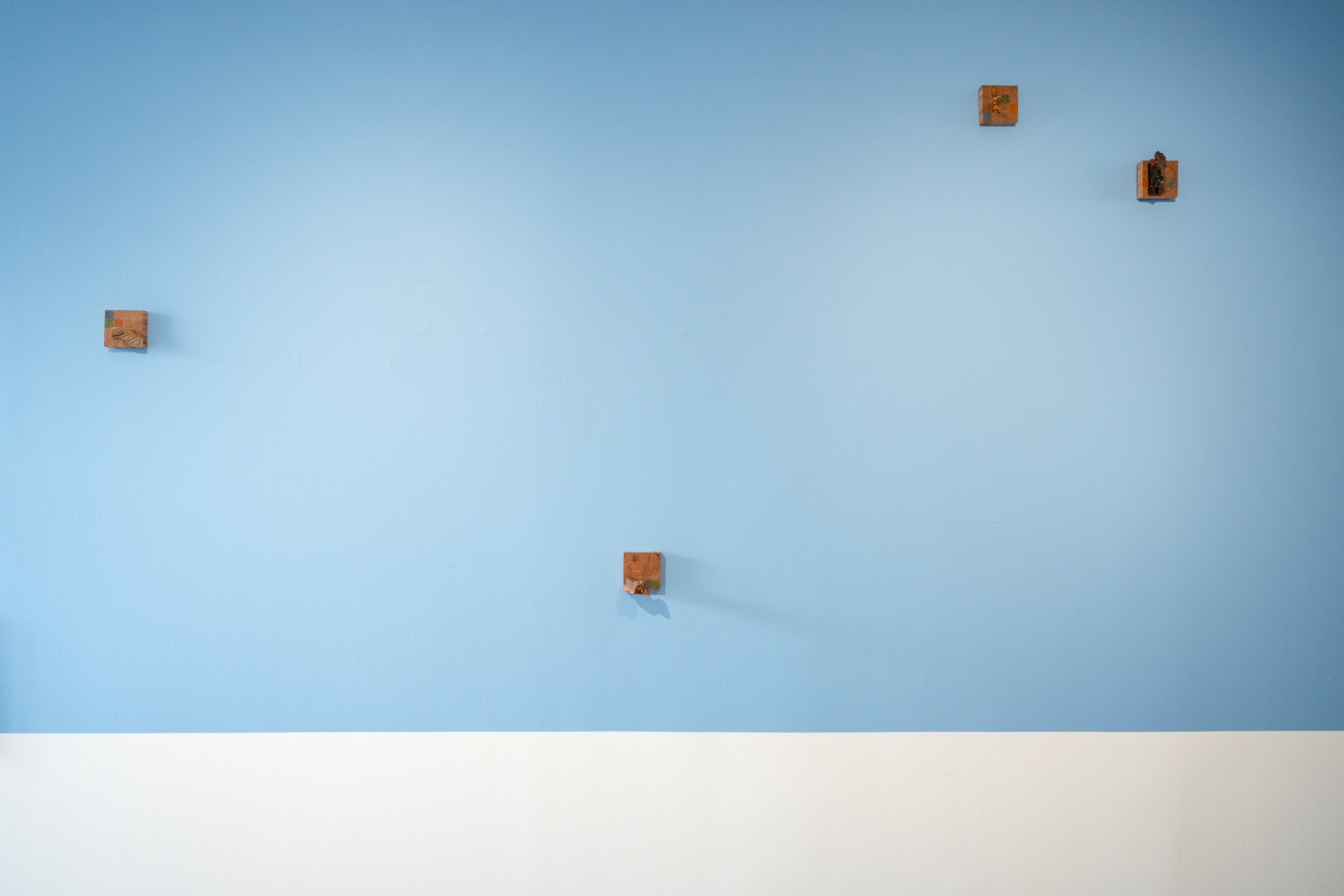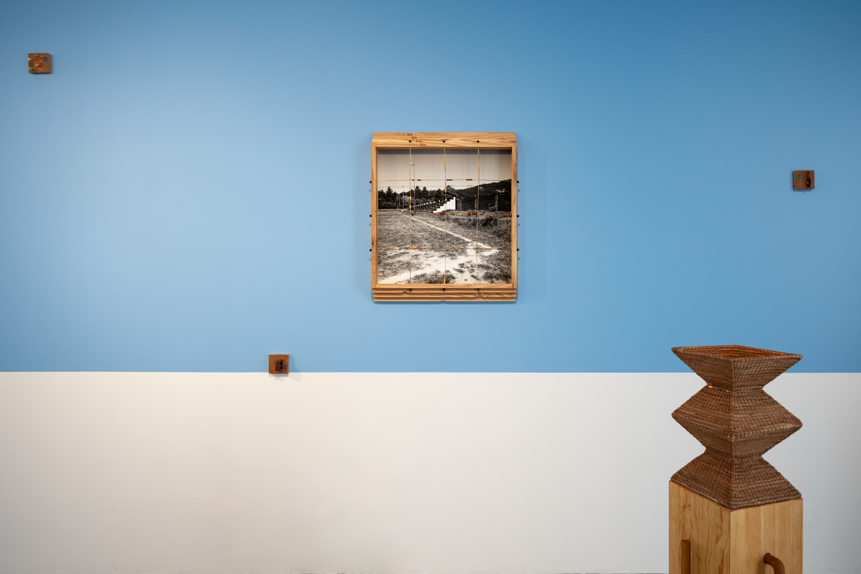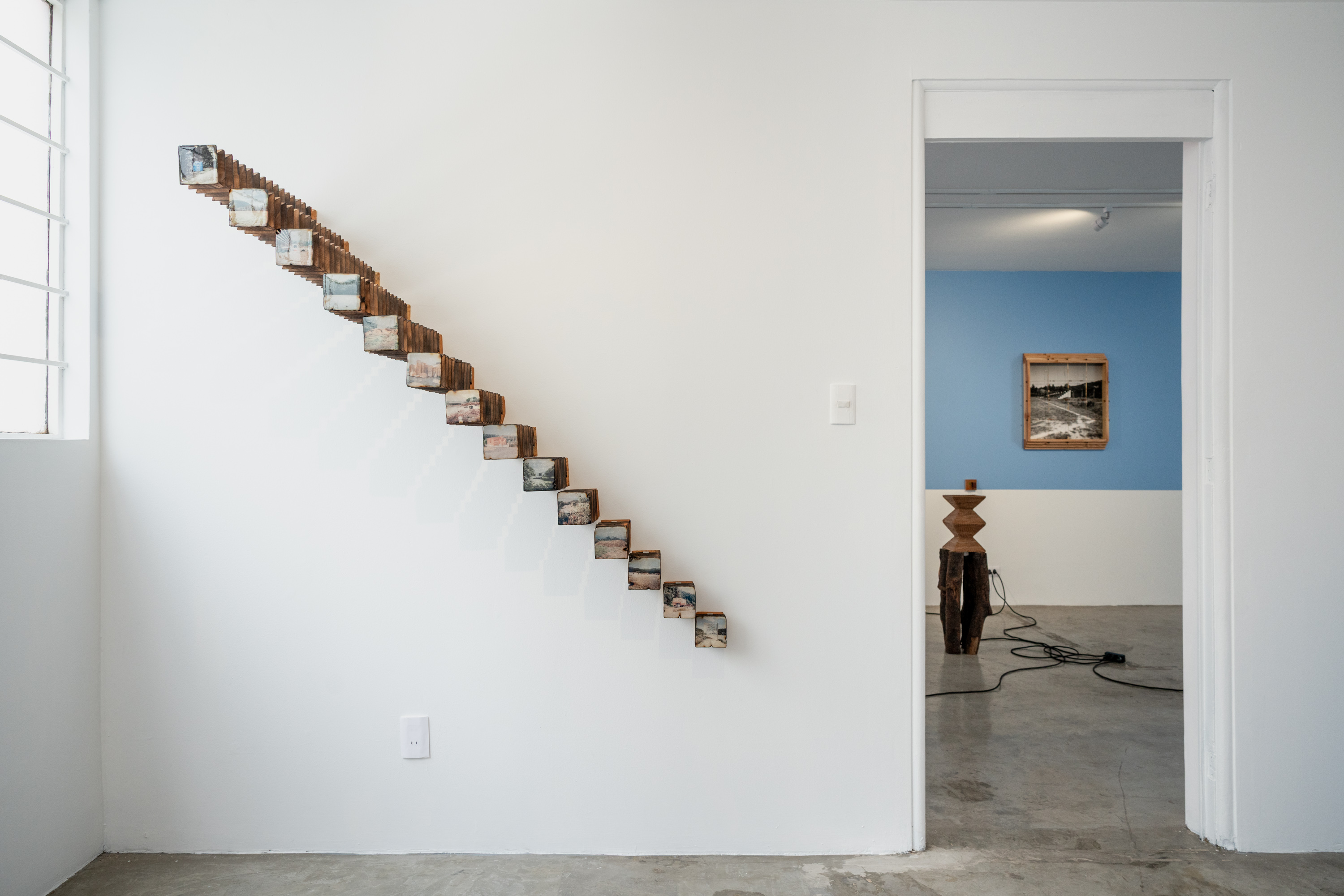 Madera local, ocoxal y latón, vinculados a la historia en los muebles tradicionales y artesanías de la región, se incorporan como extensiones del paisaje. En un juego entre la problematización entre artesanía, arte y la persistencia de las formas, al artista le interesa presentarlos como fragmentos de una red más amplia de transformaciones: extracción, uso, desgaste y recuerdos familiares. En este sentido, cada pieza participa del bosque, en tanto comparte sus ciclos de acumulación y desplazamiento, donde las imágenes nacen de procesos análogos. La diapositiva guarda una latencia contenida en su marco metálico, mientras adquiere peso, espesor, borde. La fotografía se desplaza hacia el espacio, convive con otras materias para recordarnos que sigue siendo bosque aunque materialmente transformado. Cada elemento conserva una memoria táctil, una temperatura, una manera de haber sido parte de aquel mundo, pero también se activan preguntas entre sus materiales y las imágenes que observamos. El artista se acerca a estas materialidades como superficies de reflexión: cómo un tronco deviene tabla, cómo la aguja de pino se vuelve tejido, cómo el metal se incrusta y articula. Cada transformación deja una huella, una manera específica de relación entre cuerpo, herramienta y entorno. A veces miramos hacia arriba, a veces hacia abajo, cada árbol y sus partes, no dejan de ser mundo. Al cruzarse todas las miradas, configuramos un campo donde las imágenes continúan ocurriendo y el bosque sigue siendo.