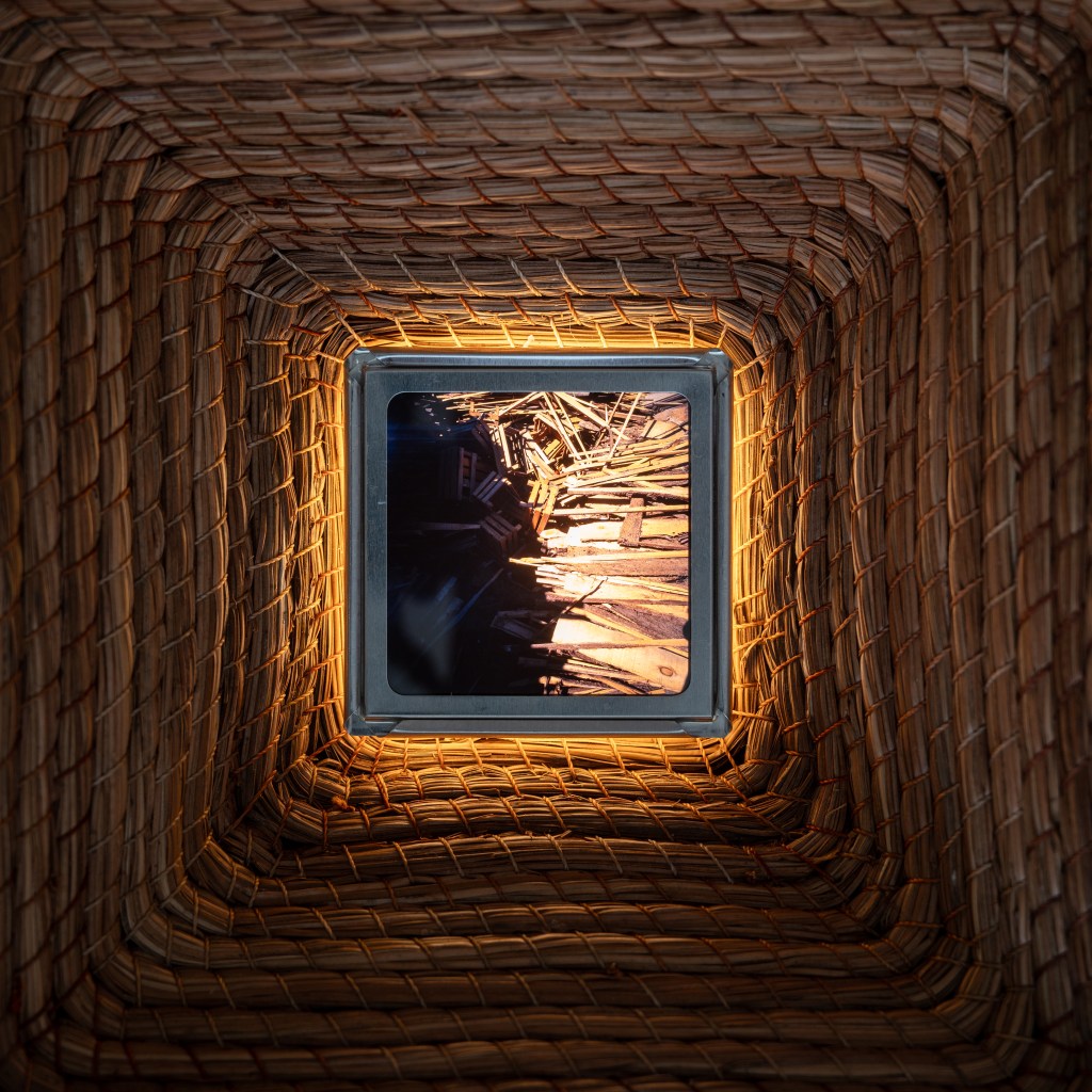 Las piezas aquí reunidas parten de imágenes y materiales provenientes de las comunidades circundantes a la Reserva de la Biósfera de la Mariposa Monarca, en el territorio compartido entre Michoacán y el Estado de México, zona donde nació y creció el artista y su familia. Arroyo-Robles no se limita a documentar ese entorno, lo reconfigura desde sus propias condiciones materiales: el cuerpo del negativo, el espesor de la diapositiva, el marco que sostiene la imagen, los monolitos que son presencia. La fotografía deja de ser superficie para volverse objeto y sujeto a la vez, volumen, materia que ocupa espacio y entra en relación con el mundo del que proviene.